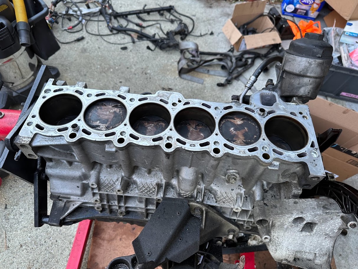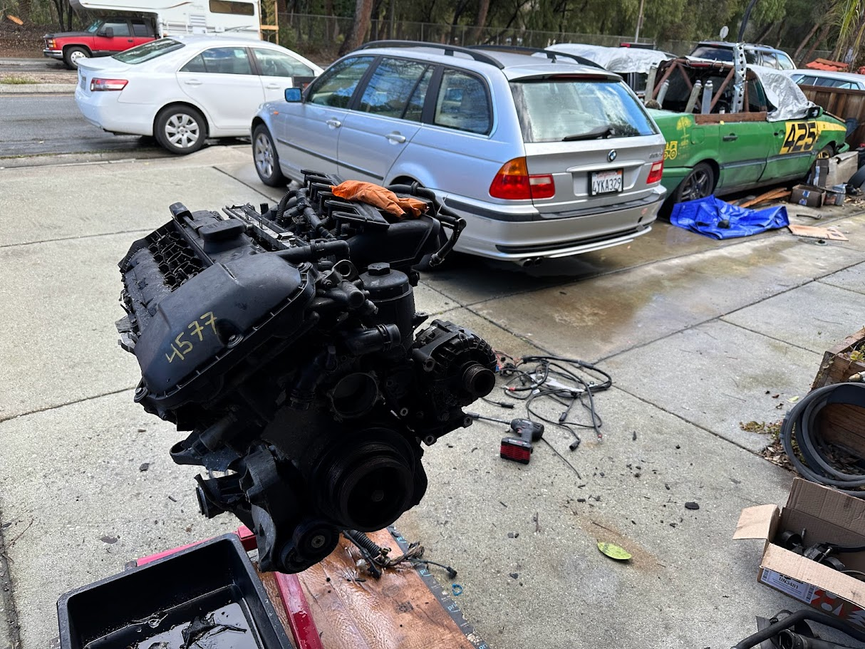 The E46 started as a very clean 325xi wagon with a blown engine from oil starvation, which made it exactly the kind of problem worth dragging home. The original goal was to make the least leaky BMW in the world by starting with a junkyard engine, redoing every seal I could get to, replacing the entire cooling system, and cleaning up everything else along the way. Being an all-wheel-drive car complicated that plan in the usual BMW way, because the front driveline passes through the oil pan and turns basic engine work into a much larger exercise.