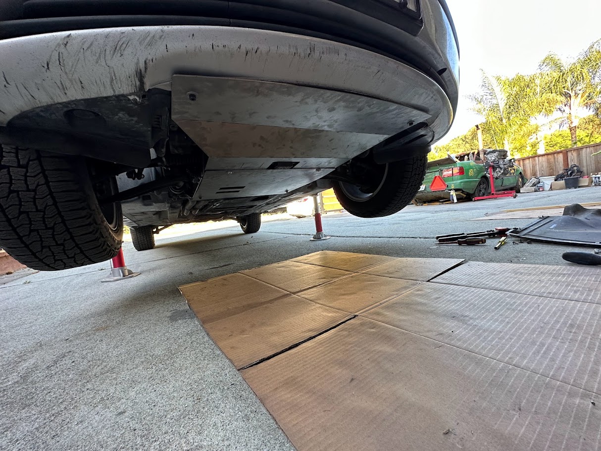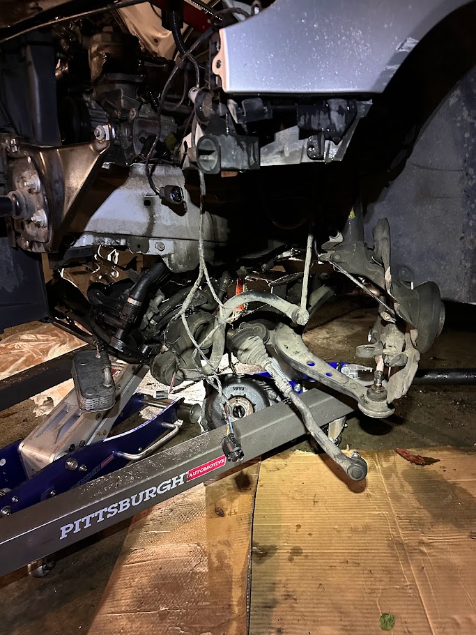 Being a 325xi complicated that plan in the usual all-wheel-drive BMW way. On this car, the front driveshaft runs through the oil pan, which means even basic engine work becomes a much larger exercise. Getting to the point where the engine could actually come out also meant pulling the front CV shafts and disassembling a good portion of the front suspension. At that point, fighting the drivetrain one piece at a time stopped making much sense.