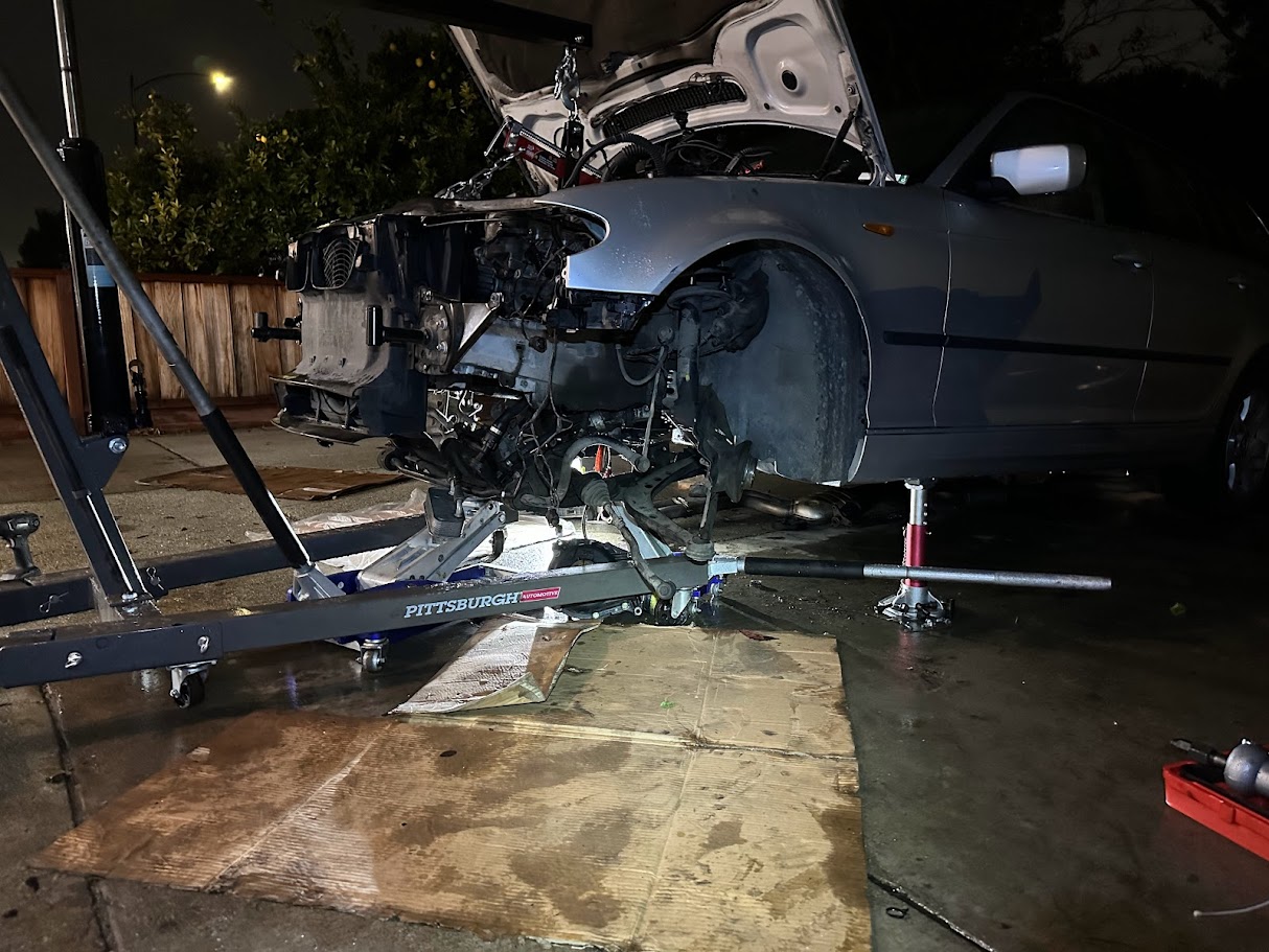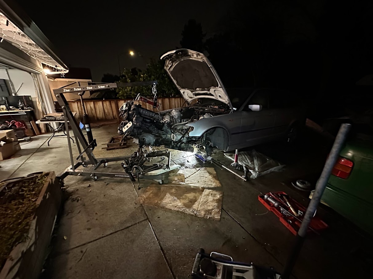 Rather than try to snake the engine out from above, I dropped the engine, transmission, and front subframe together as one complete assembly. That gave dramatically better access and also let me put it back together in roughly the same way the car would have been built at the factory, by lifting the full powertrain and suspension back in from the bottom. It was more work up front, but it made the whole job more logical once the scale of the teardown was already decided for me.