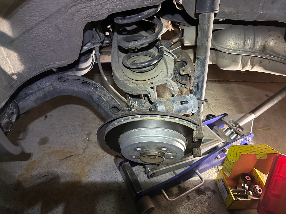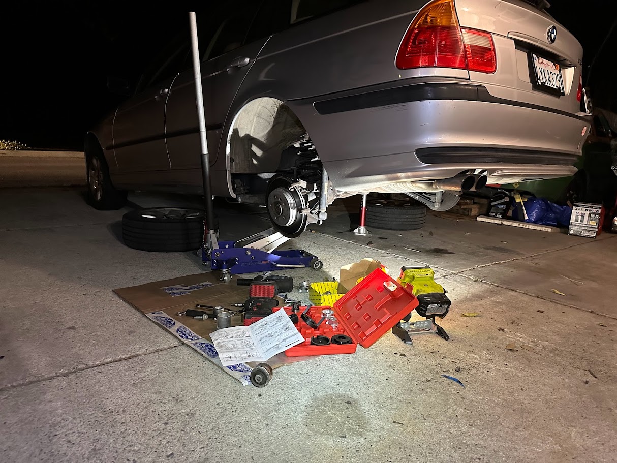 The spring swap itself was about as straightforward as suspension projects get: install the X3 rear springs and gain back roughly 30 mm of ride height. It is one of those unusually satisfying BMW fixes where the parts fit, the result is obvious, and the car immediately looks more correct afterward. While I was in there, I also pressed in new bushings in every control arm, which made the whole rear suspension feel a lot more sorted instead of just taller.