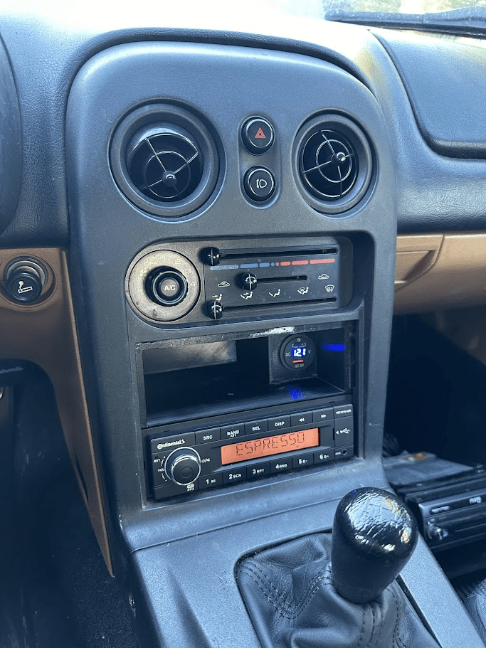 That deeper shelf is big enough to hold a full-length iPhone, which makes it actually useful rather than just decorative. The printed adapter also integrates a mount for a battery voltage gauge along with a USB-C charge port, so the whole assembly ended up doing several jobs at once without looking too out of place in the car. It is a small project, but one of those details that makes the Miata feel a lot more thought through every time I drive it.