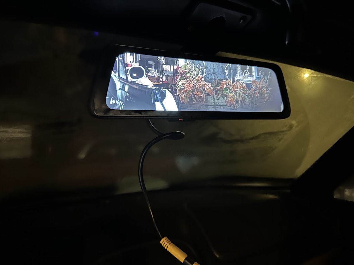 Inside the car, the display is not a conventional mirror with a small screen hidden inside it. It is a full-time display shaped like a rearview mirror that replaces the original mirror entirely. I also 3D printed the parts needed to mount it cleanly. The result is that the car always has a clear digital rear view instead of relying on whatever limited visibility the original mirror and rear window were willing to offer that day.