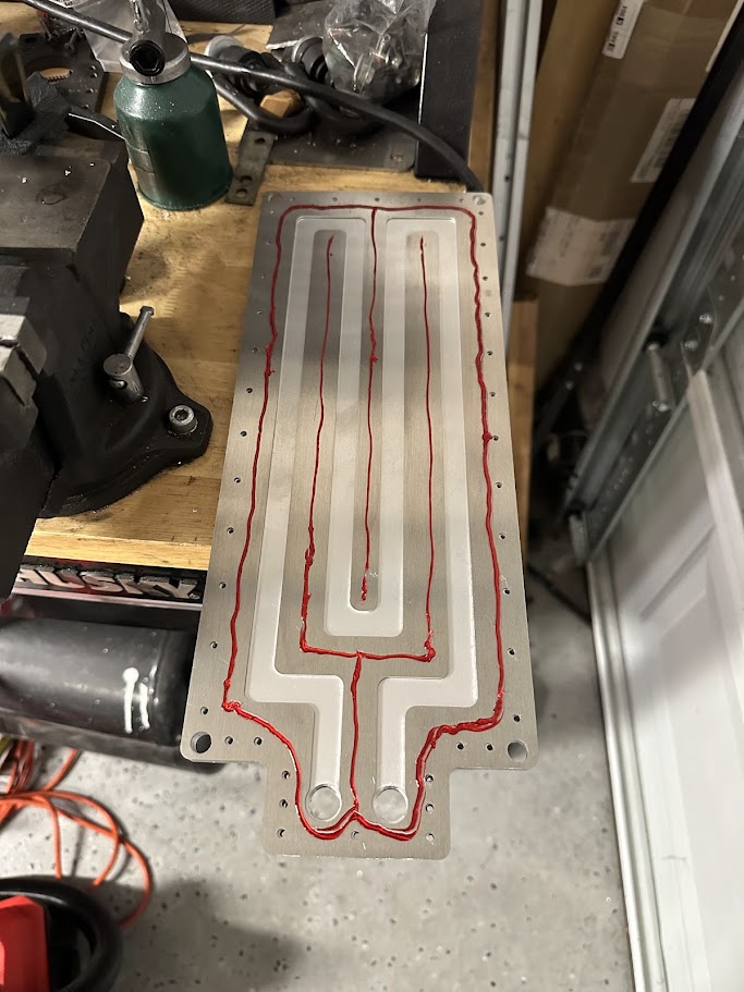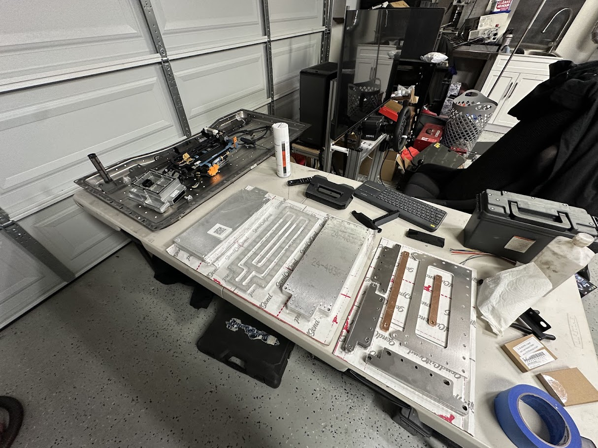 The module mounting itself was intentionally simple. I made sheet metal brackets that effectively sandwiched the modules in place, then used adapter plates to connect those new mounts back to the original module mounting points in the enclosure. The cooling plates followed the same general philosophy of making something practical and manufacturable without turning it into a science project. They were built as laser-cut sheet metal sandwiches: one flat plate, one middle plate that created the coolant flow path, and then a top cover to close the whole thing off. The layers were sealed together with anaerobic sealant for a robust, leak-free joint. Between each pair of modules and a cooling plate, I added a thermal interface material layer to improve heat transfer.