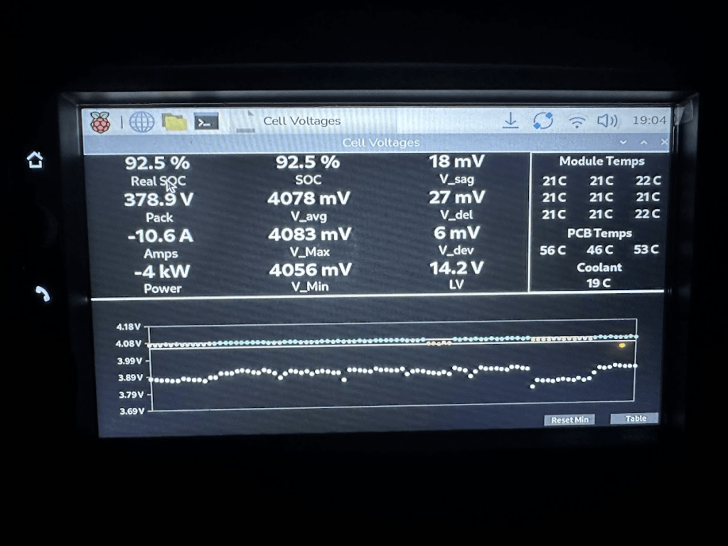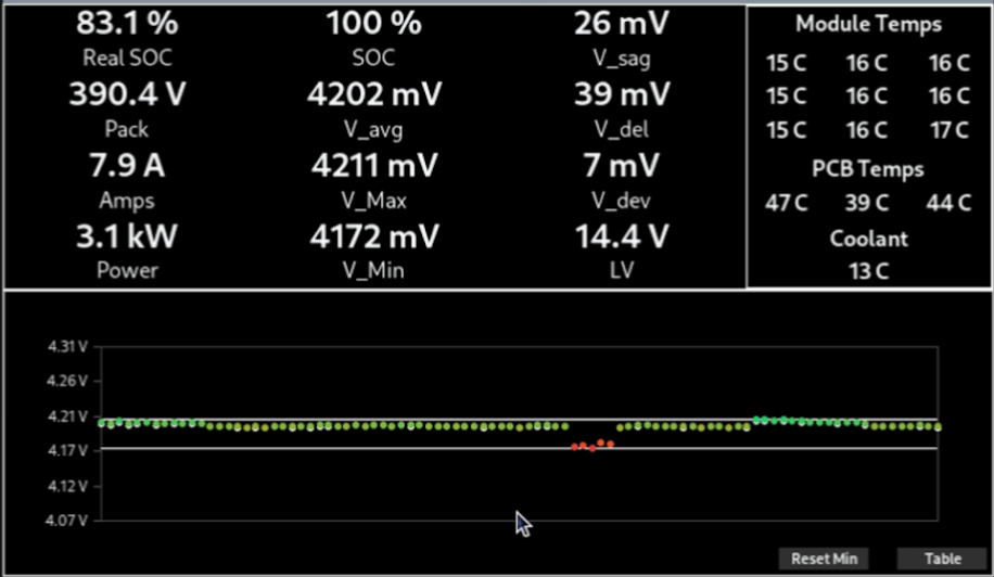 Once the first pack was built and running, the next job was figuring out whether it was actually healthy under real load instead of just technically alive. The main thing I cared about was cell voltage behavior under high current draw. A healthy module should show relatively little voltage dip, or at least a consistent voltage dip across the whole pack. To make that visible, I built a custom software tool with its own GUI so I could watch individual cell voltages in real time instead of guessing based on a few summary numbers.