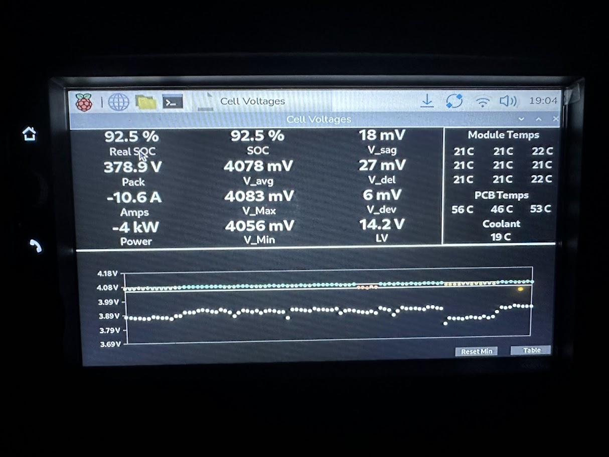 Temperature monitoring mattered just as much. The pack used nine thermistors for cell temperature sensing, along with a coolant temperature sensor and three PCB temperature sensors. That gave me enough coverage to make sure the pack was not developing a hotspot anywhere obvious and that the cooling system was doing its job. For the Samsung modules, the safe open-circuit voltage limits were roughly 3.2 to 4.2 volts per cell, so between voltage and temperature monitoring I had a pretty good view of whether the pack was behaving the way it should.